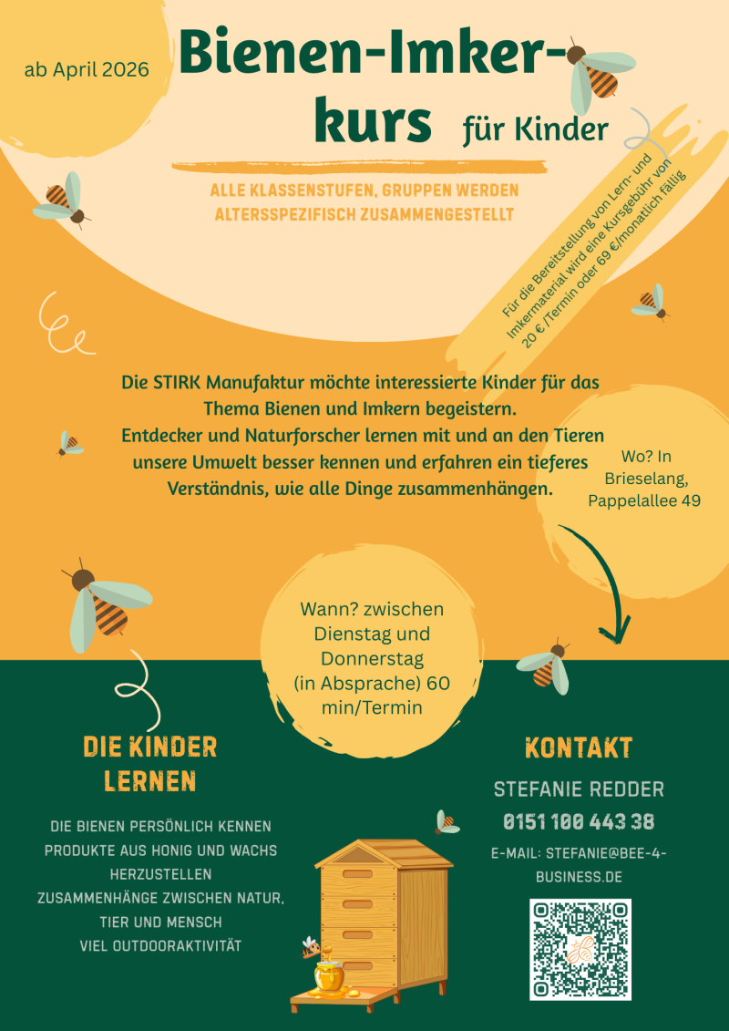 Dieser Kurs ist speziell für Kinder im Grundschulalter konzipiert und bietet für eine Bienensaison einen unvergesslichen Einblick in die wunderschöne Welt der Bienen.