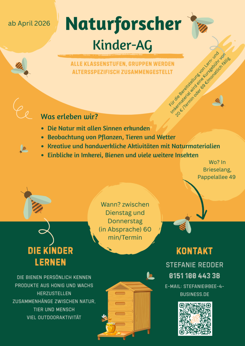 In den Oster- oder Sommerferien entdecken Grundschulkinder an vier Tagen die faszinierende Welt der Bienen – draußen, nah an der Natur und kindgerecht erklärt. Wir schauen ins Bienenvolk, lernen, warum Bestäuber so wichtig sind, und erleben, wie ein Bienenjahr funktioniert. Fragen sind ausdrücklich erwünscht – wir forschen, beobachten und staunen.